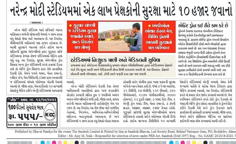 અમદાવાદ નરેન્દ્ર મોદી સ્ટેડિયમ ખાતે ભારત-પાકિસ્તાનની હાઈ વોલ્ટેજ મેચને લઈ પોલીસે લોખંડી બંદોબસ્તનો નકશો ગોઠવી દીધો છે. મેચ જોવા માટે એક લાખથી વધુ પ્રેક્ષકો સ્ટેડિયમમાં પહોંચવાના છે, ત્યારે અમદાવાદ શહેર ક્રાઈમ બ્રાન્ચ દ્વારા સ્ટેડિયમનું સઘન ચેકિંગ હાથ ધરવામાં આવ્યું હતું. ખાસ કરીને એન્ટી ડ્રોન સિસ્ટમથી સ્ટેડિયમની આસપાસ બાજ નજર રાખવામાં આવશે.